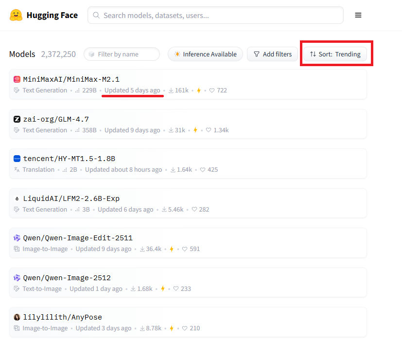 먼저 HuggingFace/models에 방문해 보겠습니다. 그러면 기본적으로 treding으로 정렬된 모델리스트가 보입니다: